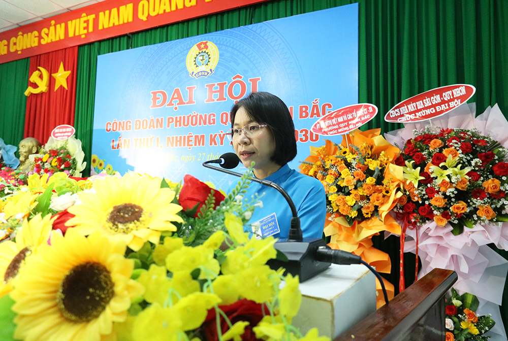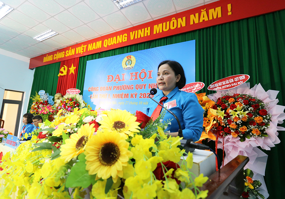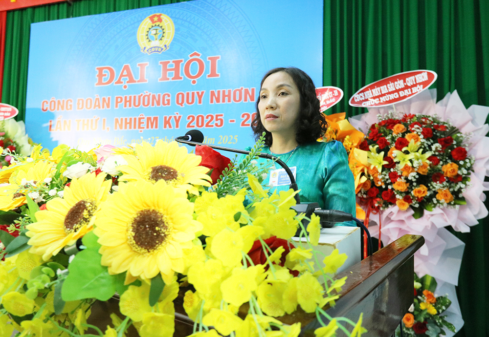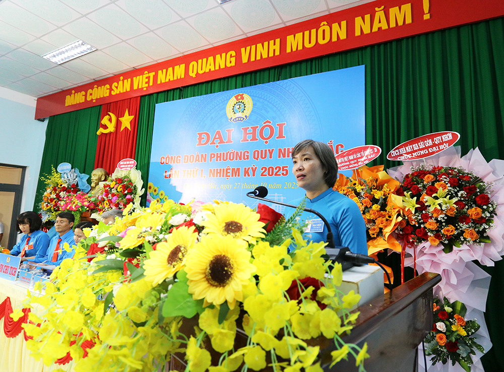 Phát biểu chỉ đạo Đại hội, đồng chí Hồ Thị Kim Ngọc - Phó Chủ tịch Thường trực Đảng ủy phường biểu dương và ghi nhận những kết quả Công đoàn phường đạt được sau 3 tháng hoạt động. Để thực hiện hiệu quả các nhiệm vụ trọng tâm trong nhiệm kỳ 2025-2030, đồng chí yêu cầu Công đoàn phường tiếp tục đổi mới nội dung, phương thức hoạt động; chú trọng công tác phát triển đoàn viên, xây dựng công đoàn cơ sở vững mạnh; thực hiện tốt chức năng đại diện, chăm lo, bảo vệ quyền và lợi ích hợp pháp, chính đáng của đoàn viên, NLĐ; chú trọng công tác tuyên truyền, giáo dục, đẩy mạnh thực hiện chuyển đổi số trong hoạt động động công đoàn. Cùng với đó, Công đoàn tăng cường phối hợp với các tổ chức trong hệ thống chính trị của phường; tập trung xây dựng tổ chức Công đoàn vững mạnh toàn diện; đẩy mạnh các phong trào thi đua yêu nước gắn với nhiệm vụ chính trị của địa phương; xây dựng đội ngũ công nhân lao động là lực lượng tiên phong trong thực hiện nhiệm vụ phát triển kinh tế - xã hội của phường Quy Nhơn Bắc...
