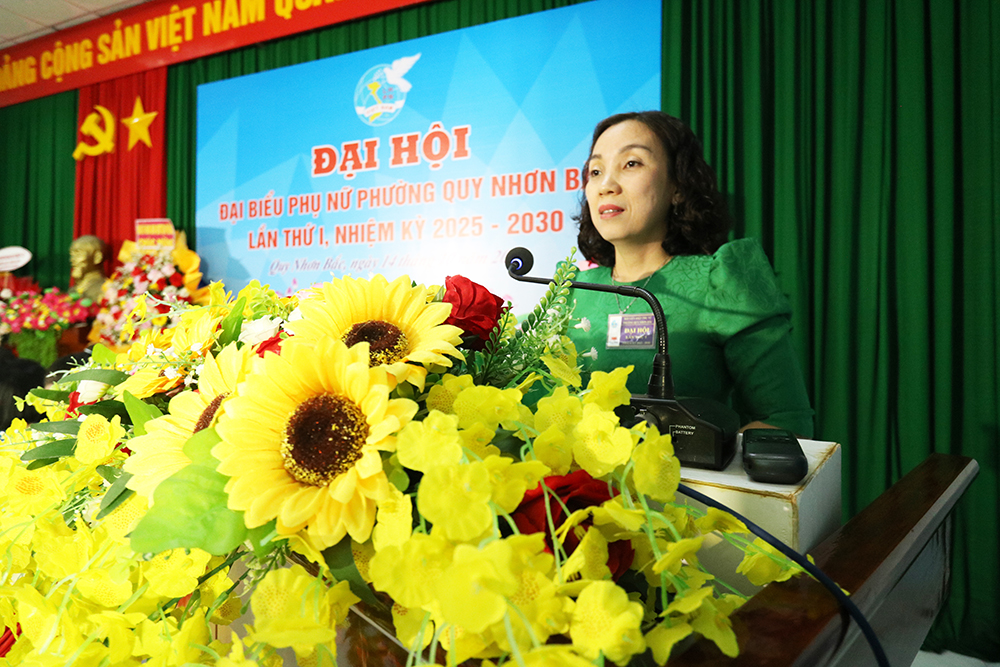 Phát biểu chỉ đạo tại Đại hội, Phó chủ tịch Thường trực Hội LHPN tỉnh Đặng Thị Hồng Hạnh, Phó Bí thư Thường trực Đảng ủy phường Hồ Thị Kim Ngọc ghi nhận và biểu dương những kết quả Hội LHPN phường đã đạt được trong thời gian qua, đồng thời nhấn mạnh, nhiệm kỳ 2025-2030, Hội LHPN phường tiếp tục đổi mới nội dung, phương thức hoạt động; hỗ trợ phụ nữ thực hiện tốt công tác chuyển đổi số, ứng dụng công nghệ thông tin; đẩy mạnh công tác tuyên truyền, giáo dục, phát huy vai trò phụ nữ trong phát triển kinh tế, khởi nghiệp sáng tạo; có nhiều hoạt động thiết thực chăm lo gia đình, bảo vệ phụ nữ và trẻ em, xây dựng gia đình no ấm, tiến bộ, hạnh phúc; vận động hội viên phụ nữ tiếp tục đoàn kết, năng động, sáng tạo, tích cực tham gia các cuộc vận động, các phong trào thi đua yêu nước; tăng cường phối hợp, phát huy sức mạnh đại đoàn kết, vận động xã hội thực hiện bình đẳng giới vì sự phát triển của phụ nữ..., góp phần xây dựng tổ chức hội ngày càng vững mạnh, xây dựng phường Quy Nhơn Bắc ngày càng phát triển, hạnh phúc.