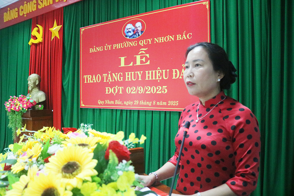 Phát biểu tại buổi lễ, đồng chí Trần Thị Như Hoa - Bí thư Đảng ủy, Chủ tịch HĐND phường Quy Nhơn Bắc khẳng định, ngày 02/9/1945 là mốc son lịch sử vĩ đại, mở ra kỷ nguyên độc lập, tự do cho dân tộc; giá trị thiêng liêng của Ngày Độc lập là thắng lợi của bản lĩnh, trí tuệ và tinh thần quật cường của toàn dân tộc dưới sự lãnh đạo sáng suốt của Đảng Cộng sản Việt Nam và Chủ tịch Hồ Chí Minh. Việc trao Huy hiệu Đảng là sự ghi nhận cao quý của Đảng đối với những đóng góp của các đảng viên, đồng thời cũng là niềm vinh dự, tự hào của gia đình và toàn Đảng bộ phường Quy Nhơn Bắc. Bí thư Trần Thị Như Hoa bày tỏ sự trân trọng đối với những công lao, đóng góp, cống hiến của các đảng viên cho sự nghiệp cách mạng của Đảng nói chung, địa phương nói riêng, mong muốn các đảng viên tiếp tục phát huy tinh thần tiên phong, gương mẫu, đóng góp ý kiến để xây dựng Đảng bộ, chính quyền và Nhân dân phường ngày càng vững mạnh, góp phần thực hiện thắng lợi các mục tiêu, nhiệm vụ Nghị quyết Đại hội Đảng bộ phường Quy Nhơn Bắc lần thứ I, nhiệm kỳ 2025-2030 đề ra.