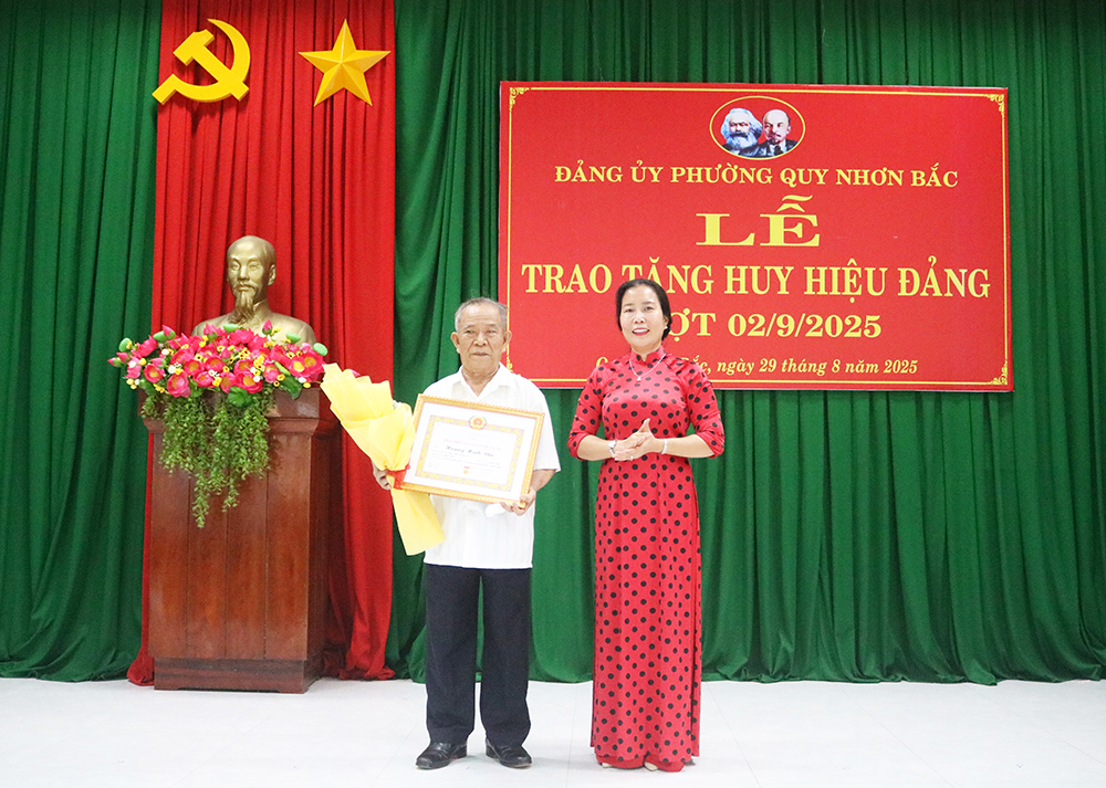 Sáng 29/8, Ban Thường vụ Đảng ủy phường Quy Nhơn Bắc tổ chức lễ trao Huy hiệu Đảng đợt 02/9/2025 cho các đảng viên đang sinh hoạt tại các tổ chức đảng trực thuộc Đảng ủy phường.