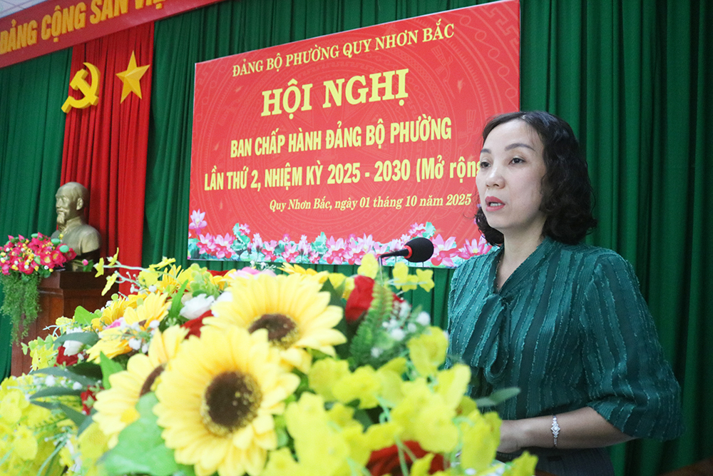 Phát biểu kết luận Hội nghị, đồng chí đồng chí Trần Thị Như Hoa - Bí thư Đảng ủy, Chủ tịch HĐND phường ghi nhận, biểu dương những kết quả cấp ủy, chính quyền, Mặt trận Tổ quốc, các đoàn thể và Nhân dân phường Quy Nhơn Bắc đã đạt được trong thời gian qua. Đồng chí Bí thư nhấn mạnh, trong 3 tháng cuối năm, toàn Đảng bộ phường tiếp tục phát huy tinh thần đoàn kết, nêu cao trách nhiệm, tập trung triển khai quyết liệt, hoàn thành Kế hoạch phát triển kinh tế - xã hội, kế hoạch đầu tư xây dựng cơ bản và chỉnh trang đô thị năm 2025. Tăng cường công tác quản lý đất đai, xây dựng, trật tự đô thị, vệ sinh môi trường. Quan tâm nâng cao công tác y tế, giáo dục. Cùng với đó, chú trọng công tác xây dựng Đảng, nâng cao chất lượng sinh hoạt chi bộ, phát triển đảng viên mới; đẩy mạnh cải cách hành chính, ứng dụng chuyển đổi số, nâng cao chất lượng phục vụ Nhân dân. Quan tâm công tác an sinh xã hội, chăm lo đời sống nhân dân; giữ vững an ninh chính trị, trật tự an toàn xã hội, chuẩn bị chu đáo công tác tuyển quân năm 2026. Chủ động chuẩn bị mọi điều kiện cho công tác phòng chống thiên tai, bão lũ từ phường đến khu phố. Tăng cường công tác phổ biến, quán triệt, triển khai thực hiện Nghị quyết Đại hội đại biểu Đảng bộ phường lần thứ I, Nghị quyết Đại hội đại biểu Đảng bộ tỉnh Gia Lai lần thứ I, nhiệm kỳ 2025 - 2030; đồng thời, tổ chức tốt Đại hội Mặt trận và các hội, đoàn thể của phường nhiệm kỳ 2025 - 2030...