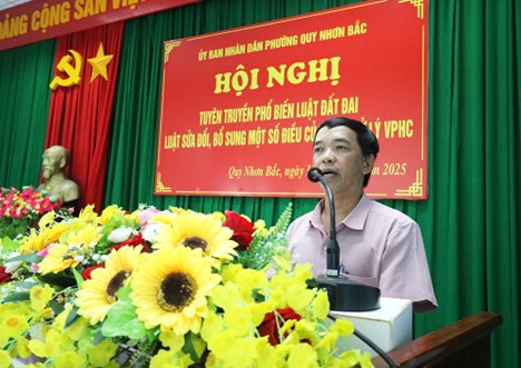 Chiều 15/10, UBND phường Quy Nhơn Bắc tổ chức Hội nghị tuyên truyền, phổ biến pháp luật cho cán bộ, công chức, viên chức phường; hội viên, đoàn viên các hội - đoàn thể; Ban điều hành 16 khu phố; Tuyên truyền viên, hòa giải viên cơ sở; Tổ trưởng an ninh trật tự cơ cở 16 khu phố trên địa bàn phường. Dự hội nghị có đồng chí Nguyễn Quốc Tân - Phó Chủ tịch Thường trực UBND phường Quy Nhơn Bắc.