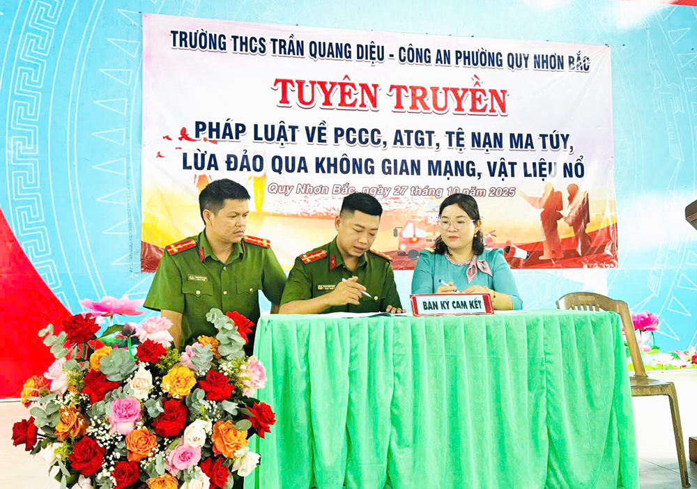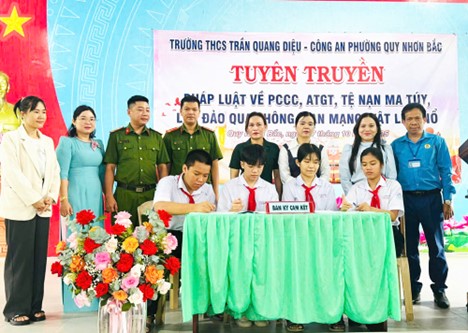 Dịp này, Công an phường và Trường THCS Trần Quang Diệu đã tổ chức cho giáo viên, học sinh ký cam kết chấp hành nghiêm các quy định về giao thông, phòng chống tác hại ma túy, an toàn PCCC; chấp hành quy định về Luật Quản lý, sử dụng vũ khí, vật liệu nổ và công cụ hỗ trợ, Luật an ninh mạng, không sử dụng thuốc lá điện tử và thuốc lá nung nóng.