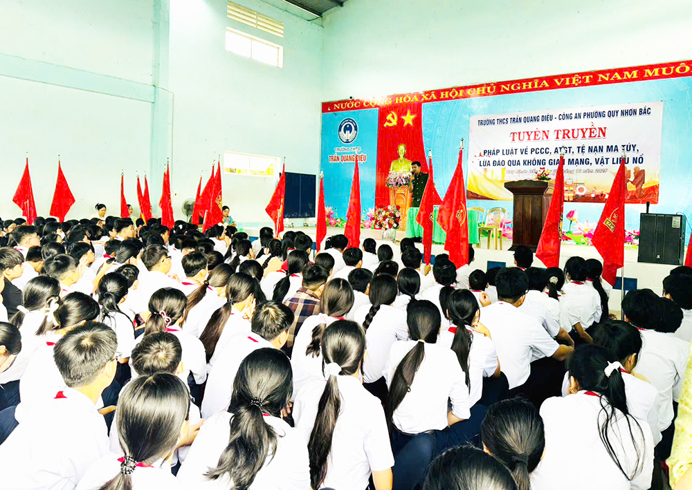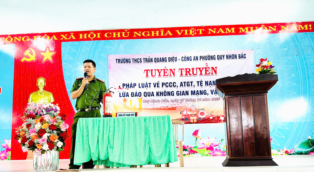 Sáng 27/10, Công an phường Quy Nhơn Bắc phối hợp Ban Giám hiệu Trường THCS Trần Quang Diệu tổ chức tuyên truyền kiến thức pháp luật về PCCC, ATGT, tệ nạn ma túy, lừa đảo qua không gian mạng, vật liệu nổ cho 1.559 giáo viên, nhân viên và học sinh toàn trường.