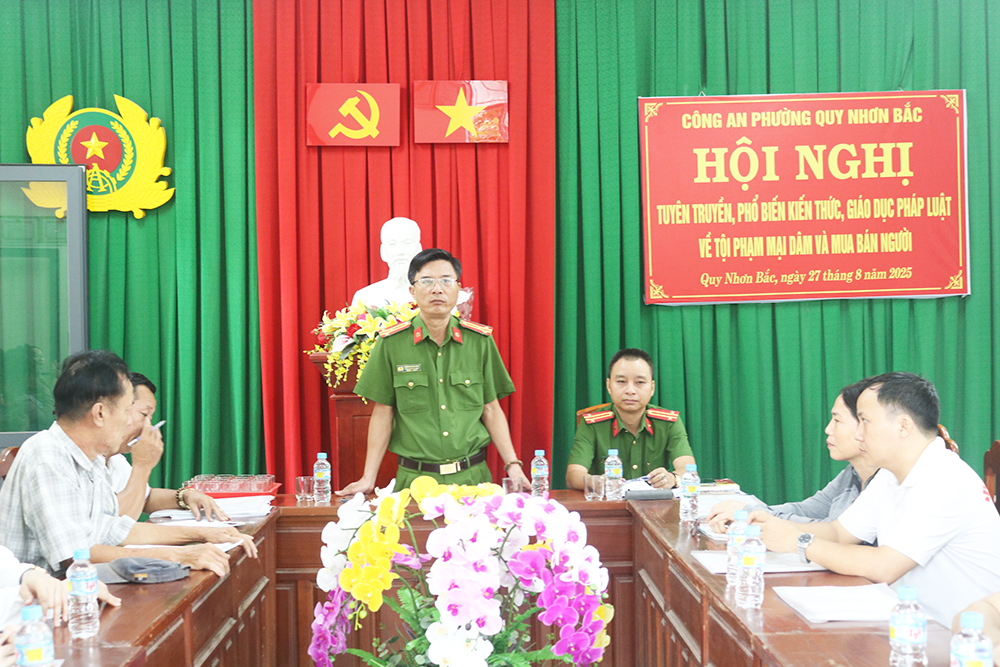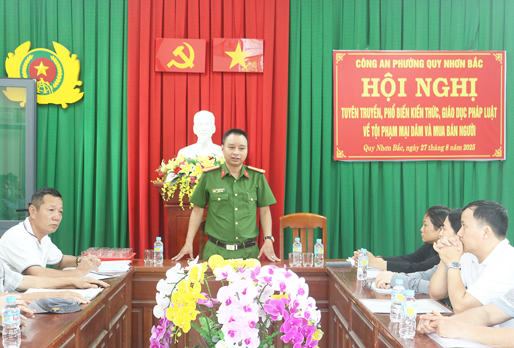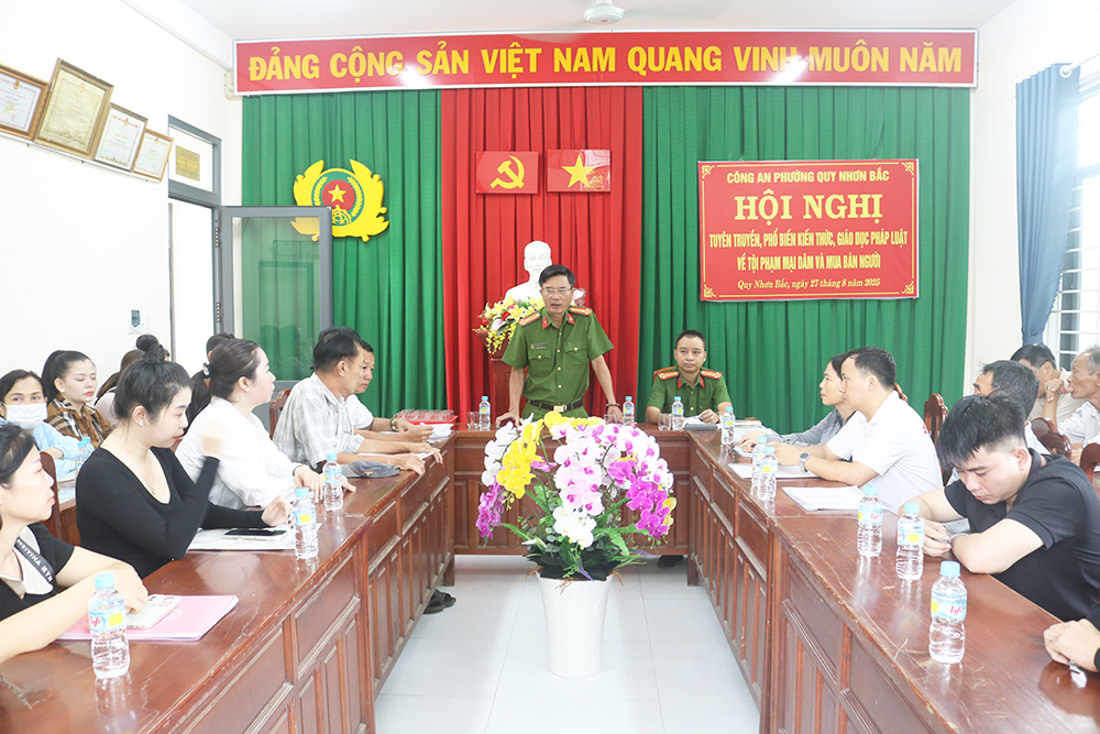 Sáng 27/8, Công an phường Quy Nhơn Bắc tổ chức Hội nghị tuyên truyền, phổ biến kiến thức giáo dục pháp luật về tội phạm mại dâm, mua bán người cho 49 cơ sở dịch vụ kinh doanh có điều kiện (Massage, Karaoke, Khách sạn, Nhà nghỉ) trên địa bàn phường.